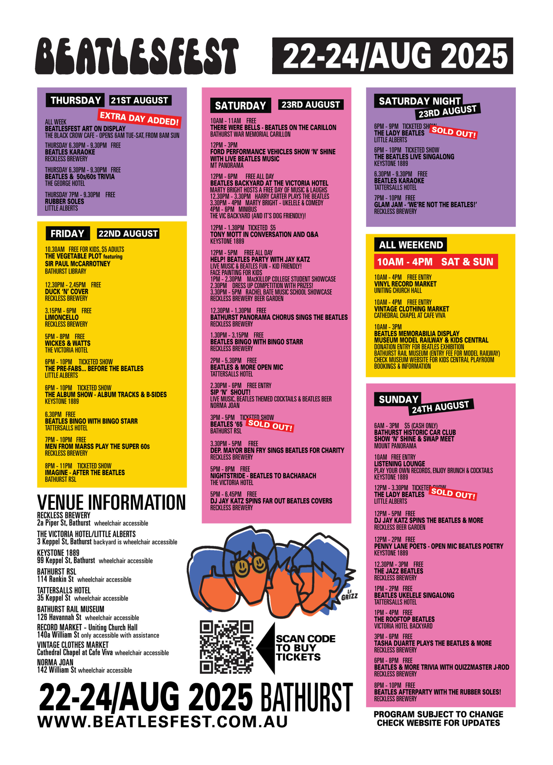 The buzz has been incredible, with both headline ticketed shows — The Lady Beatles and Beatles 65 — already sold out. Another crowd favourite, the Beatles Live Singalong, is also selling fast and is expected to book out within days. But the magic of Beatlesfest isn’t limited to paid events. The majority of the program is free, with activities running all day Friday, Saturday, and Sunday in venues right across Bathurst.